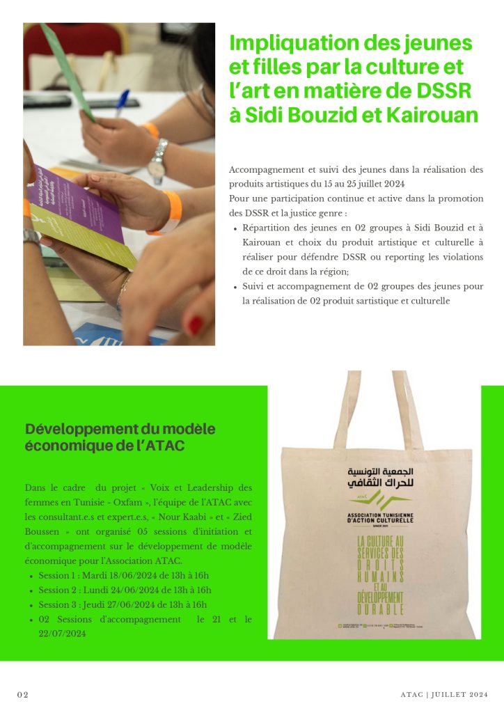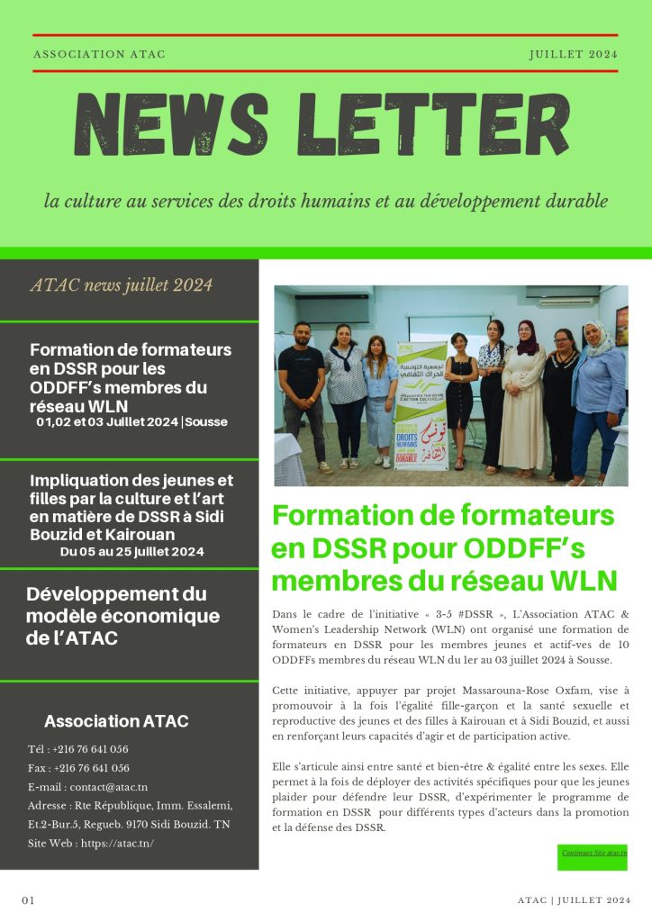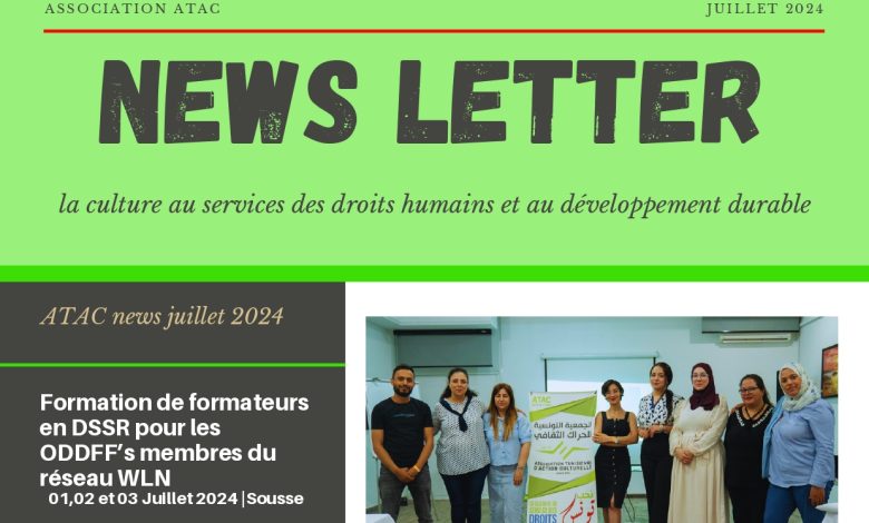 Accueil/News/ATAC News Letter | Juillet 2024 News ATAC News Letter | Juillet 2024 ATAC Envoyer un courriel 5 août 20240 40 Moins d’une minute Facebook X Linkedin Pinterest Reddit Skype Messenger Messenger WhatsApp Telegram Viber Partager par email ATAC News Letter juillet 2024Télécharger Tags2024 Art ATAC Droit DSSR Femmes Juillet Kairouan Sidi Bouzid ATAC Envoyer un courriel 5 août 20240 40 Moins d’une minute Facebook X Linkedin Pinterest Reddit Skype Messenger Messenger WhatsApp Telegram Viber Partager par email Partager Facebook X Linkedin Tumblr Pinterest Reddit VKontakte Odnoklassniki Pocket Partager par email Imprimer